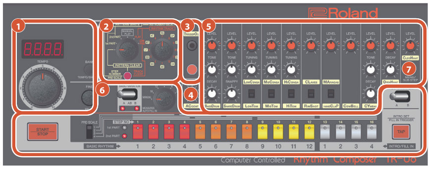 | Select switch | Selects an instrument. AC (ACCENT), BD (BASS DRUM), SD (SNARE DRUM), LT (LOW TOM), MT (MID TOM), HT (HI TOM), RS (RIM SHOT), CP (HAND CLAP), CB (COWBELL), CY (CYMBAL), OH (OPEN HIHAT), CH (CLS’D HIHAT) |